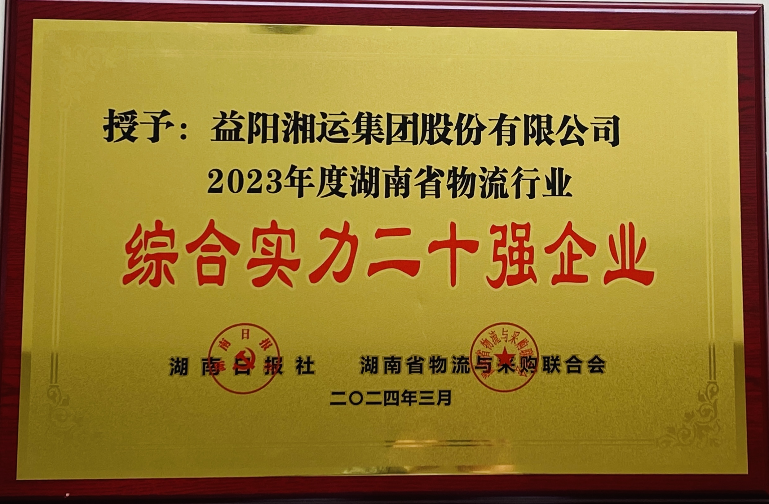 3月26日,益陽湘運集團股份有限公司獲“2023年度湖南省物流行業(yè)綜合實力二十強企業(yè)”。